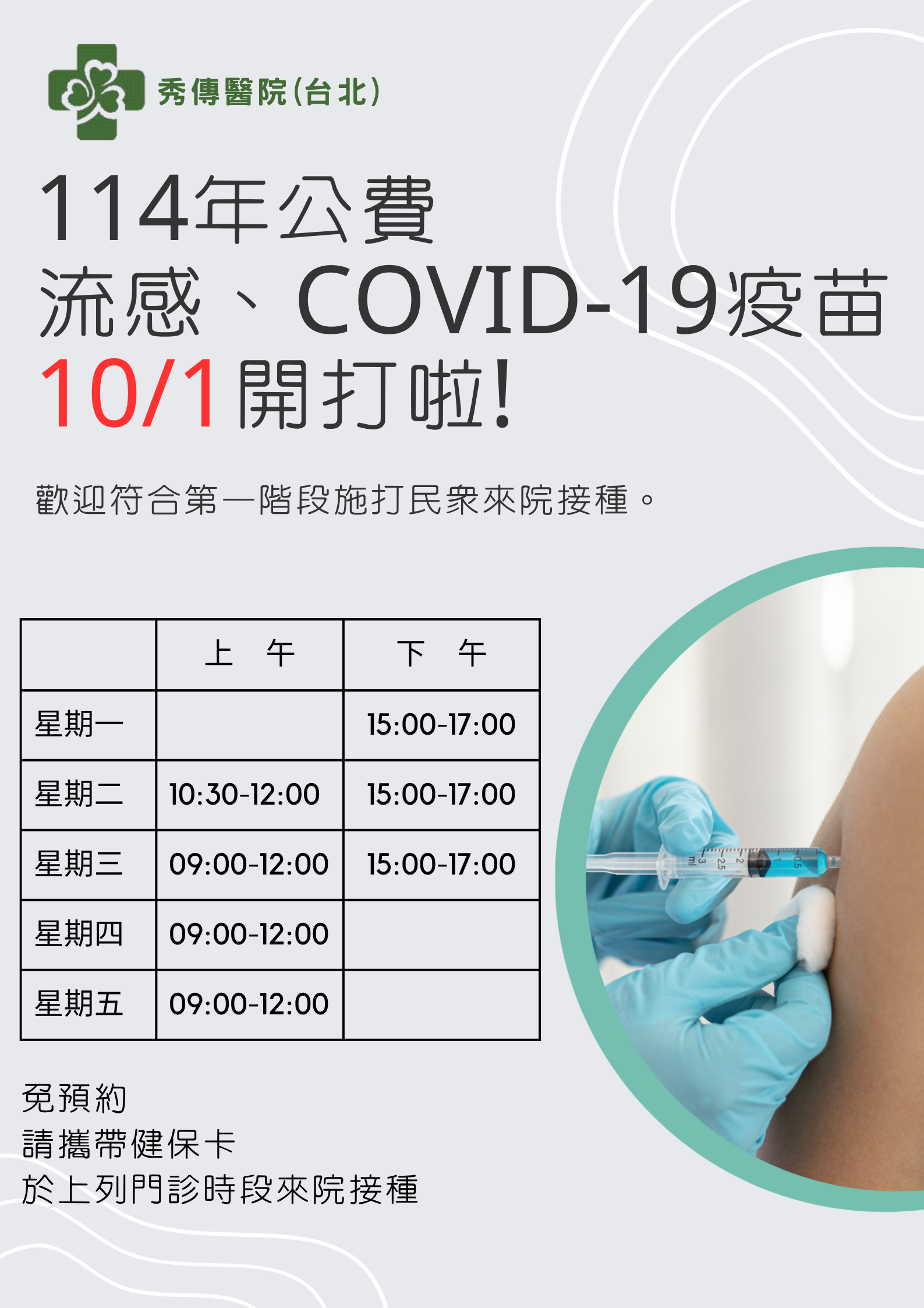 2025-09-30 114年公費流感、COVID-19疫苗10/1開打 回上一頁 用藥安全 秀傳醫院病床數護病比一覽表 疾病諮詢Q&A 人才招募 COVID-19疫苗預約 其他院所 北秀減重門診官網 秀傳醫療體系 彰化秀傳醫院 彰濱秀傳醫院 員林何醫院 田中仁和醫院 竹山秀傳醫院 台南市立醫院 高雄岡山醫院 亞洲微創中心 國際醫療中心